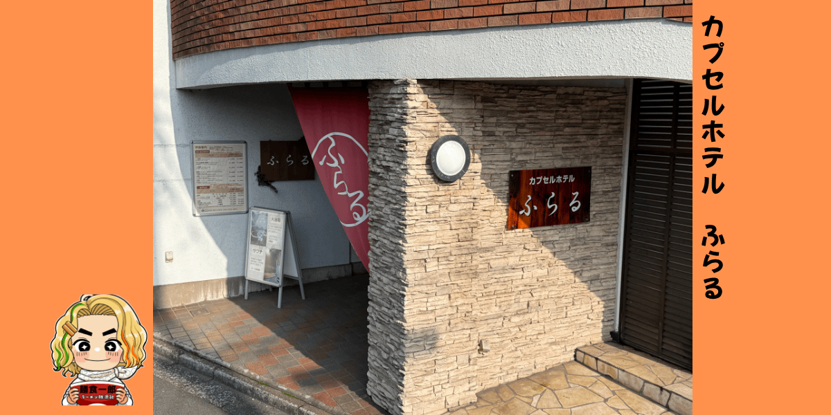 カプセルホテルふらるの入口外観 赤いのれんと看板が目印(千葉市)